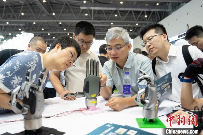 6月20日至22日,2025杭州国际人形机器人与机器人技术展览会在浙江杭州举办。图为参观者围绕机器人手部技术展开讨论。 吴君毅 摄