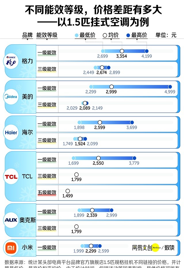 其实,有些一级能效空调也就一千多,比三级能效还便宜。