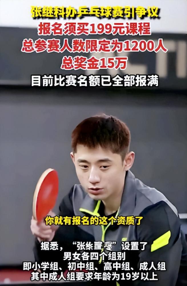 张继科以个人名义主办乒乓球赛事,单站最高奖金15万元吸引超1200人报名。