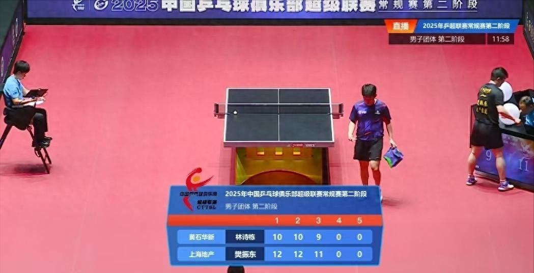 两个人第一局打到9比9平,樊振东连得两分赢了。林诗栋第二局开局领先,后来又被追上,最后还是输了。第三局同样局面,又是樊振东在关键时刻得分。这比赛看得人心跳,特别是最后几分,樊振东处理球特别冷静。
