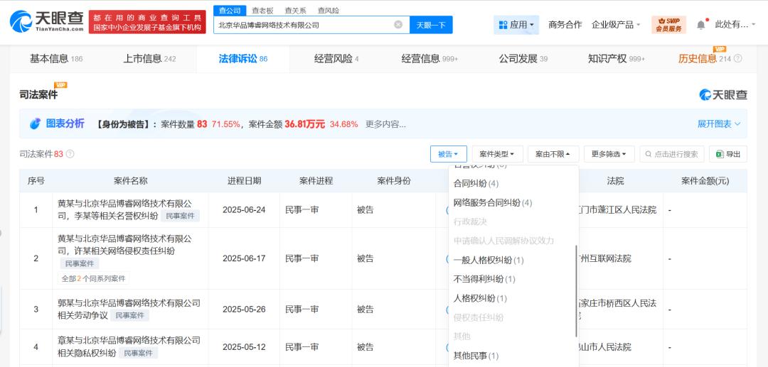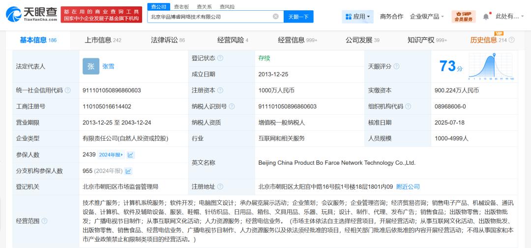 天眼查App显示,Boss直聘关联公司北京华品博睿网络技术有限公司成立于2013年12月,法定代表人为张雪,注册资本1000万人民币,经营范围含技术推广服务、计算机系统服务、软件开发、企业管理咨询、经济贸易咨询、广播电视节目制作、从事互联网文化活动、人力资源服务等,由赵鹏、岳旭共同持股。司法案件信息显示,该公司涉及多起诉讼案件,案由涉及网络侵权责任纠纷、不当得利纠纷、人格权纠纷等。值得一提的是,近日,该公司发生工商变更,赵鹏卸任法定代表人,由张雪接任。