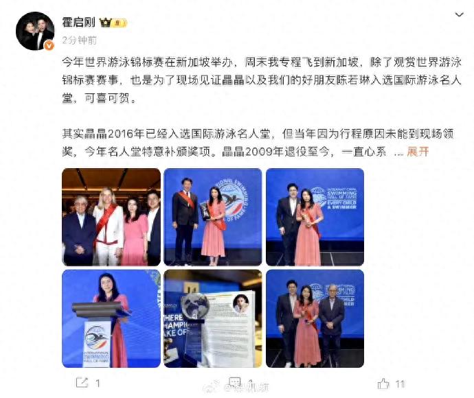 7月28日,霍启刚发文向世界游泳界传递喜讯。他在社交媒体上表示,今年世界游泳锦标赛在新加坡盛大举办,他周末特地飞往新加坡,除了观赏赛事,更是为了现场见证晶晶以及他们的好朋友陈若琳入选国际游泳名人堂这一光荣时刻。
