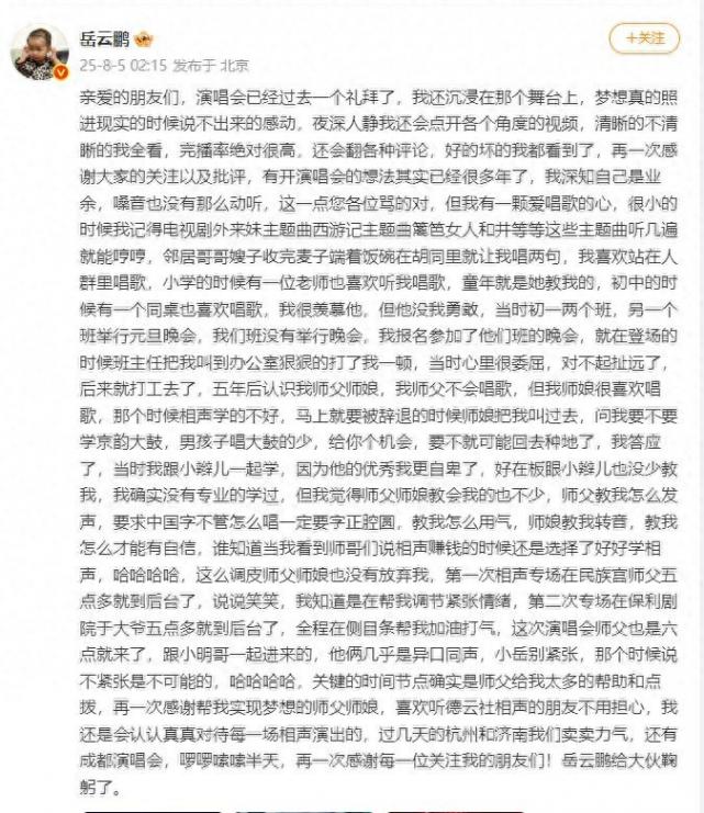 凌晨2:15,小岳岳甩出千字小作文再谈演唱会争议。