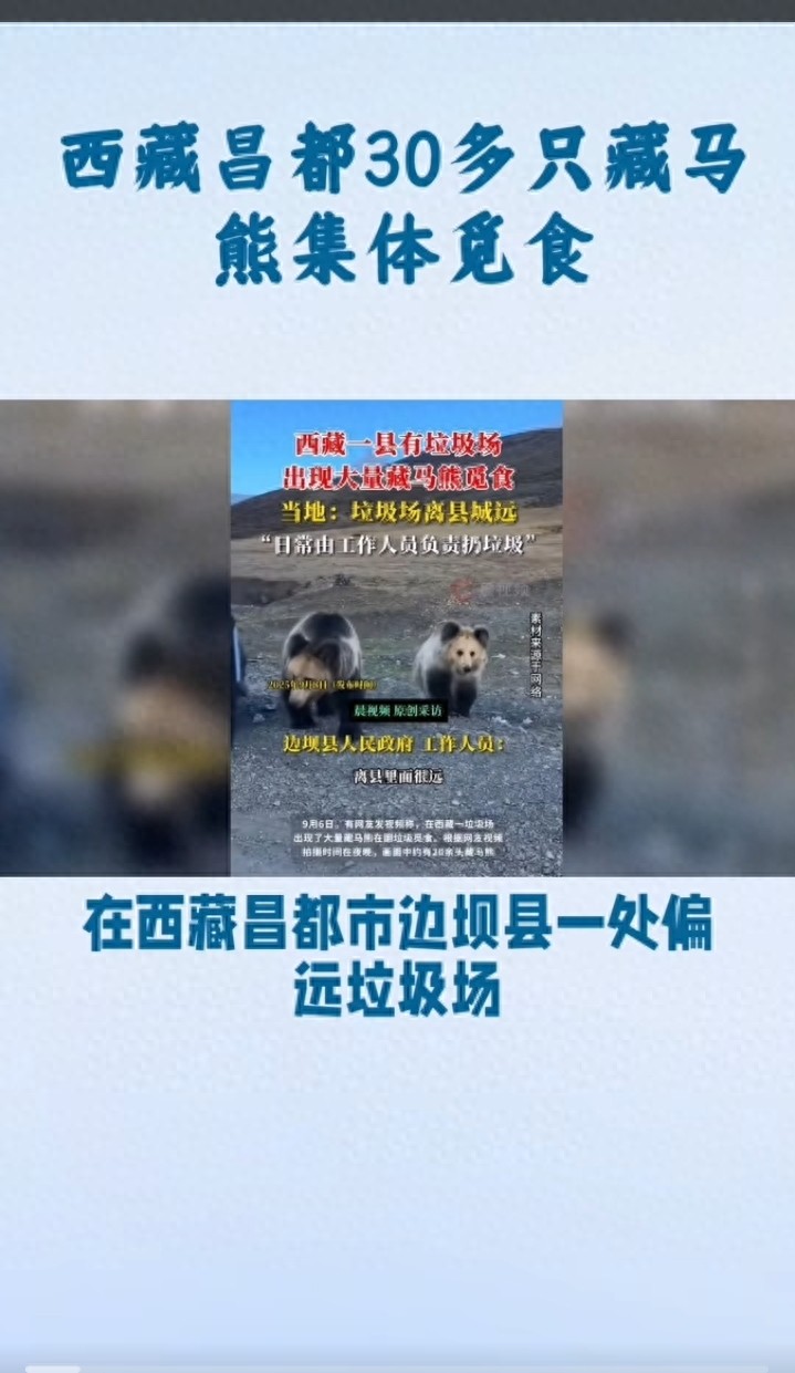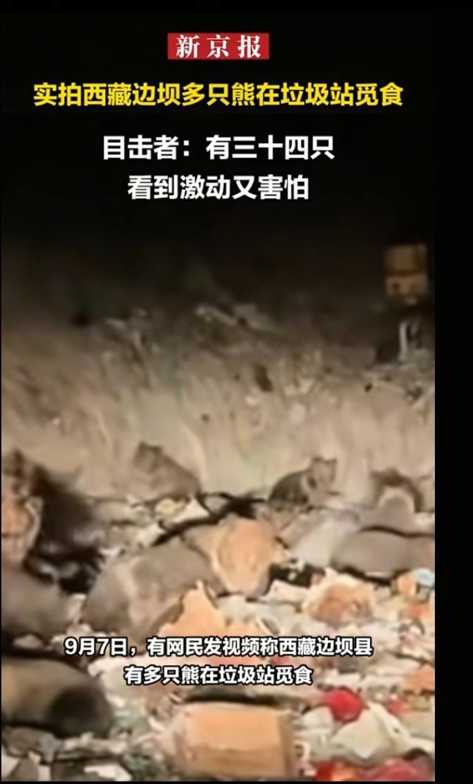 2025年9月5日或6日夜间(报道时间略有差异),在西藏昌都市边坝县一处偏远山区的垃圾场,有人目睹并拍摄到约20-40只藏马熊(西藏棕熊) 在此集体觅食。目击者称,熊群数量大约有三四十只,他在一旁观察了半小时,期间熊群一直在觅食并未离开。目击者当时心情既激动又害怕。