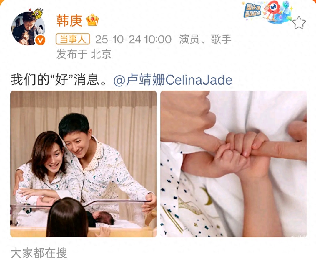 10月14日,韩庚在社交平台上发出喜讯,官宣卢靖姗已经生了,是一个“好消息”,从字面理解,两人2022年9月第一胎生下女儿,现在第二胎是一个男宝宝,凑成了一个“好”字,韩庚卢靖姗夫妇结婚第六年已经儿女双全,可喜可贺。