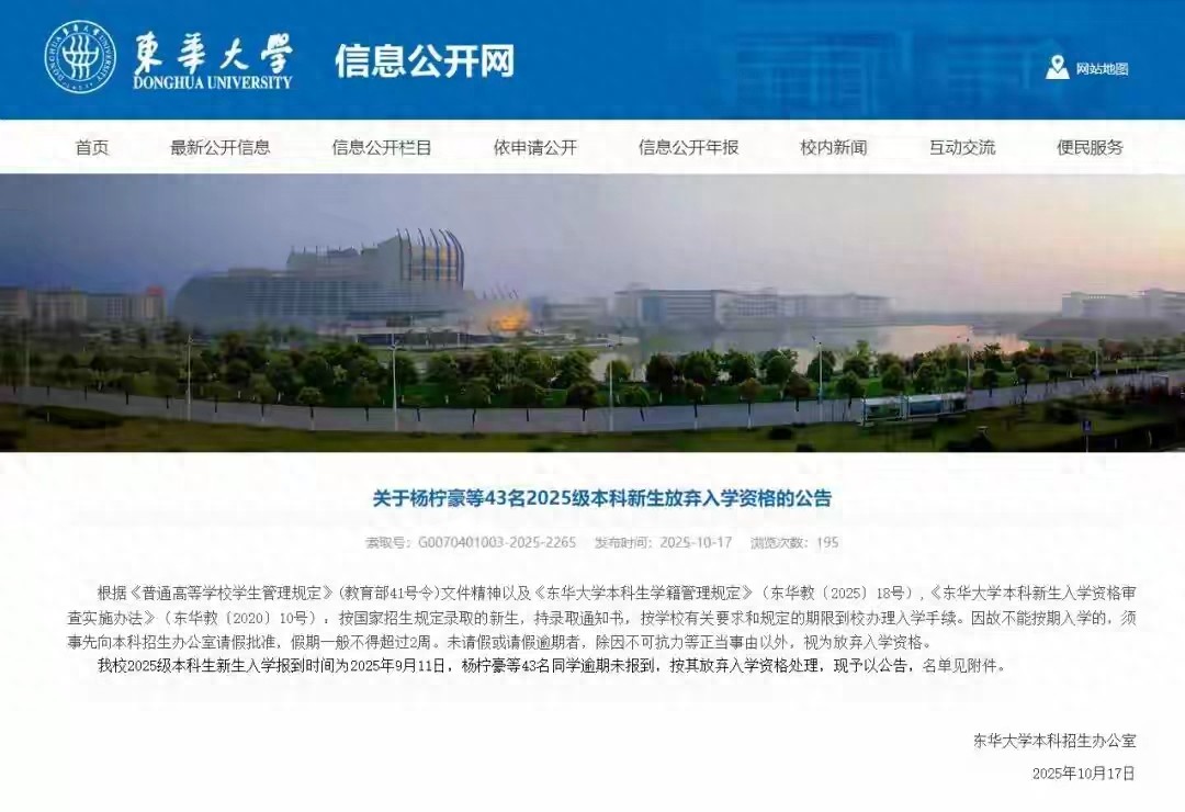 10月25号,上海的东华大学上了热搜——这所211、双一流大学,公示了43个2025级新生没去报到,按放弃入学资格算,一下子引了好多人讨论。