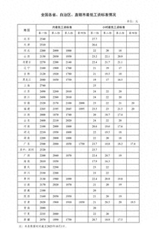 《意见》提出,将月最低工资标准由现行的2100元调整为2360元;将非全日制用工的小时最低工资标准由现行的20元调整为23元。调整后的标准从2025年11月1日起执行。