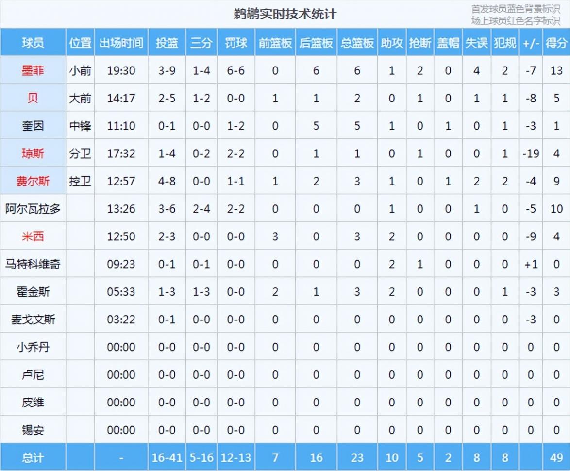 鹈鹕:墨菲13分6板全场最高,阿尔瓦拉多10分,费尔斯9分3板,其他球员得分均未上双,全队三分球命中率不足30%。